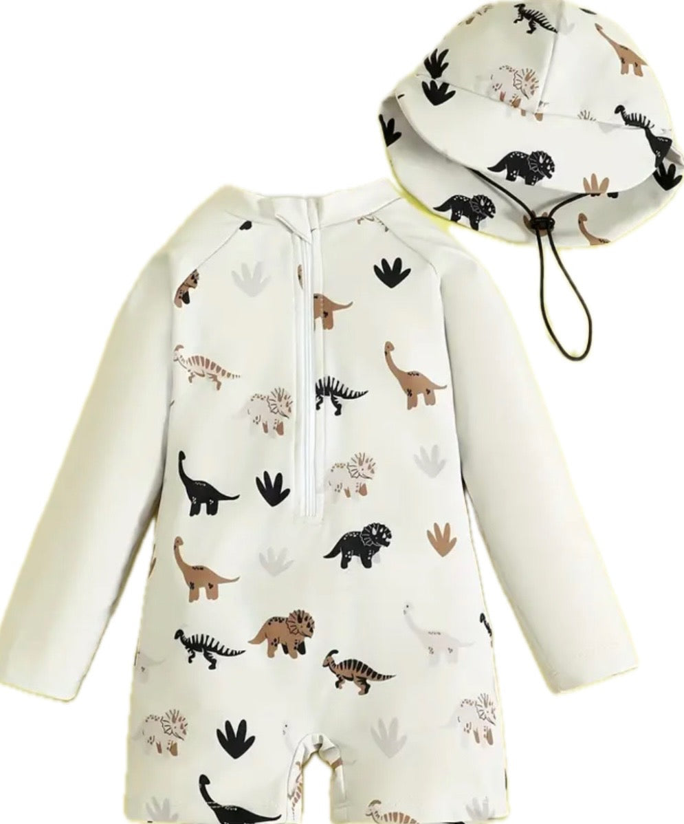 Let your little adventurer dive into summer fun with the RLO Clothing Toddler Dinosaur Swim Set. This adorable two-piece set features a long-sleeve all-in-one swimsuit and a matching sun hat, both decorated with a playful dinosaur print in soft, neutral tones.
